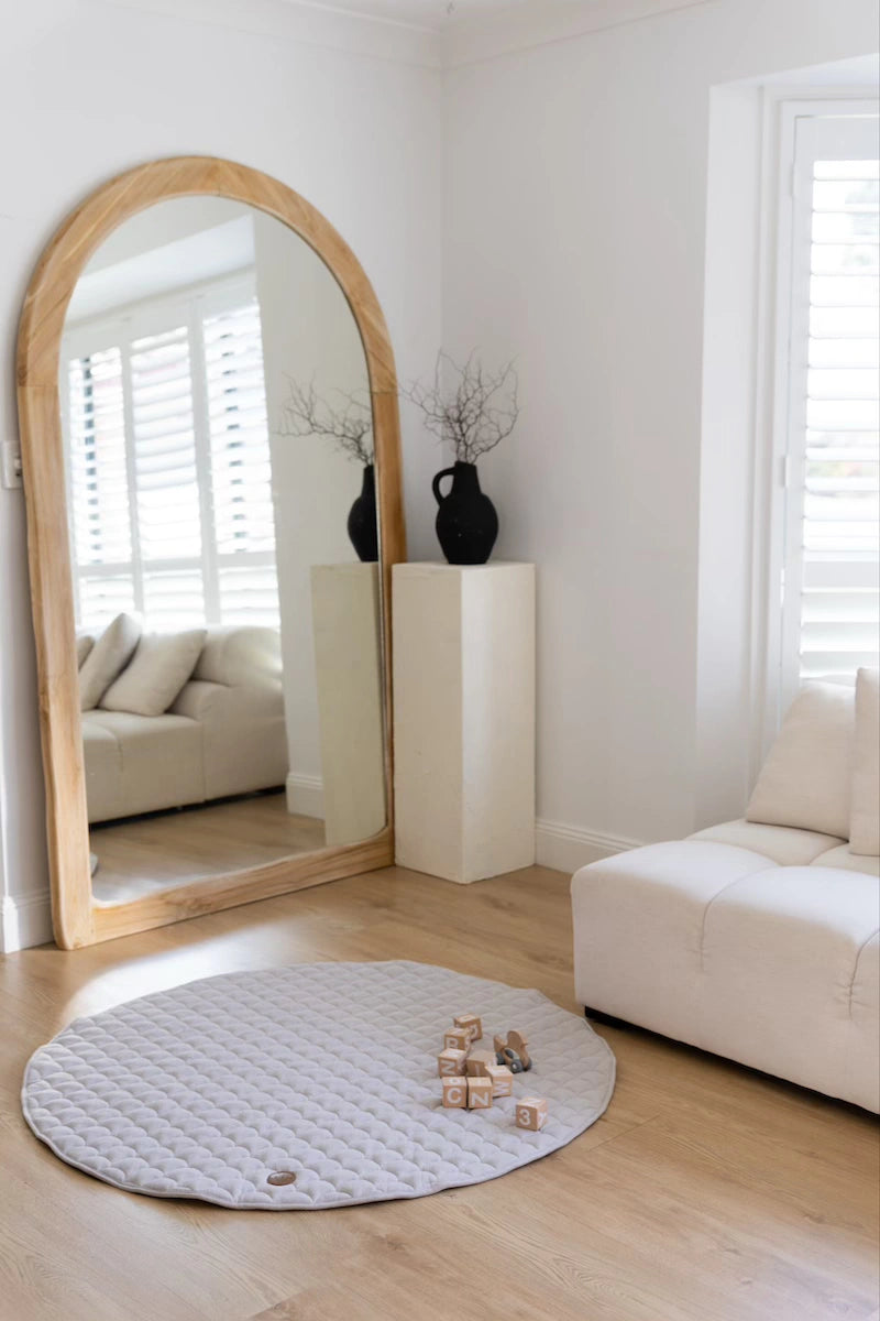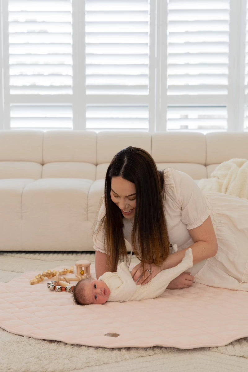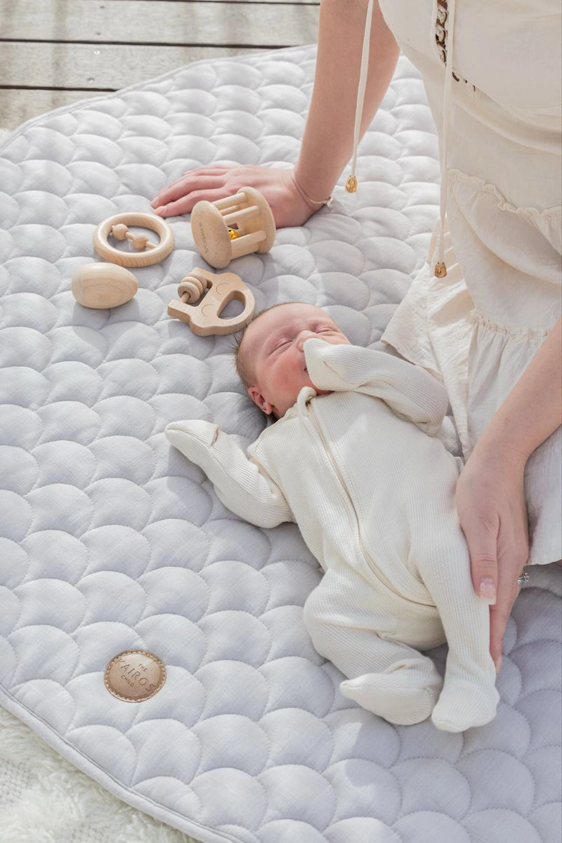 We're all about minimalism with our play mats. Although sensory stimulation is crucial for a baby's body and brain to comprehend itself and the environment, excessive sensory messages can quickly overwhelm the brain's ability to comprehend and respond, leading to sensory overload. Too many textures, primary colours, toys and more can cause overstimulation for a baby - and a mum too! We love the idea of a clean neutral play mat with less distraction, where you can choose to slowly start introducing new textures, interactive toys, mirrors or games when you feel the time is right!
